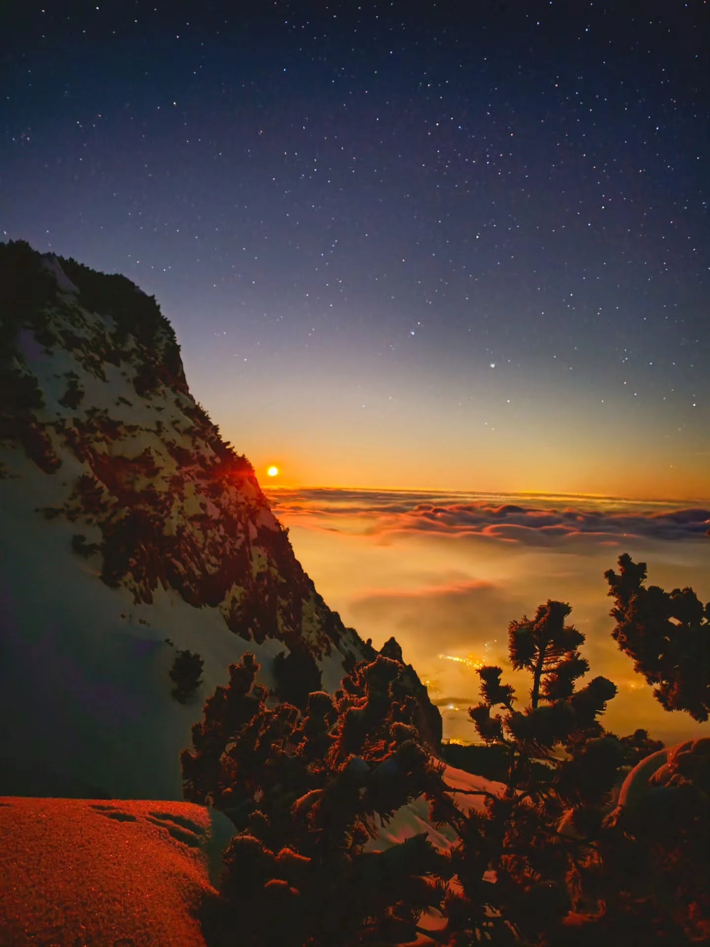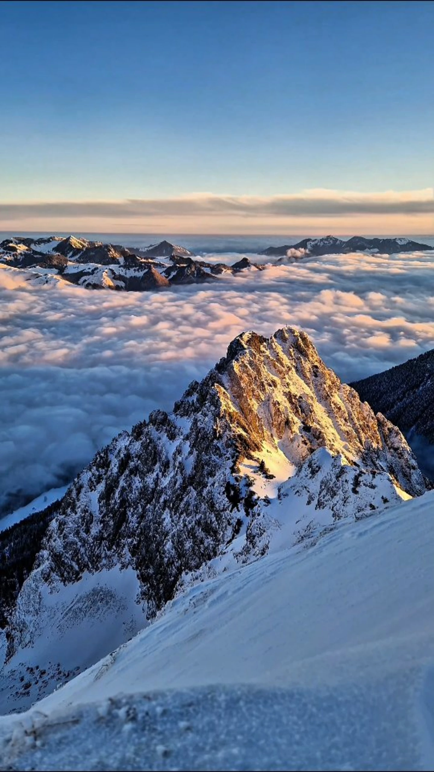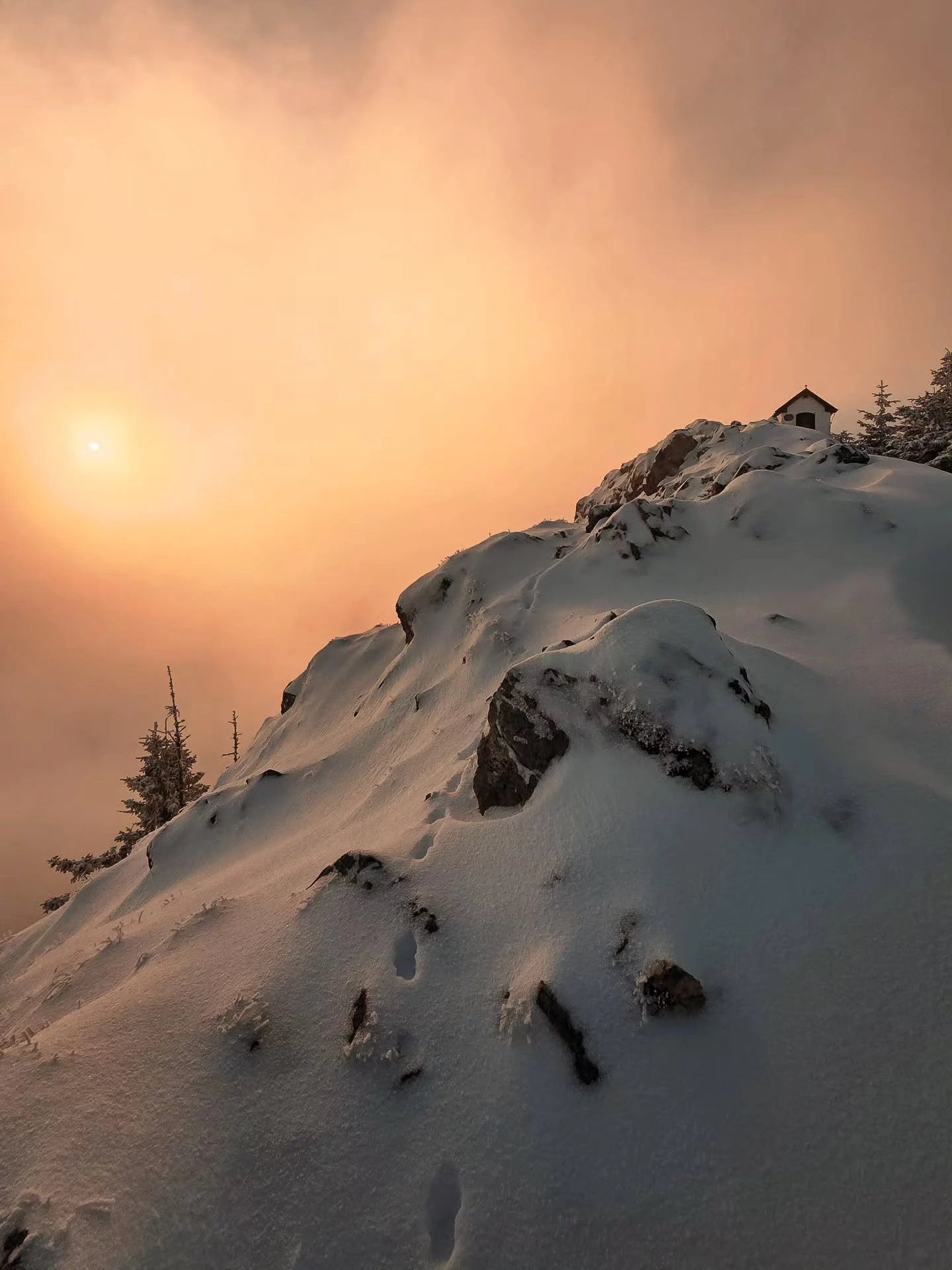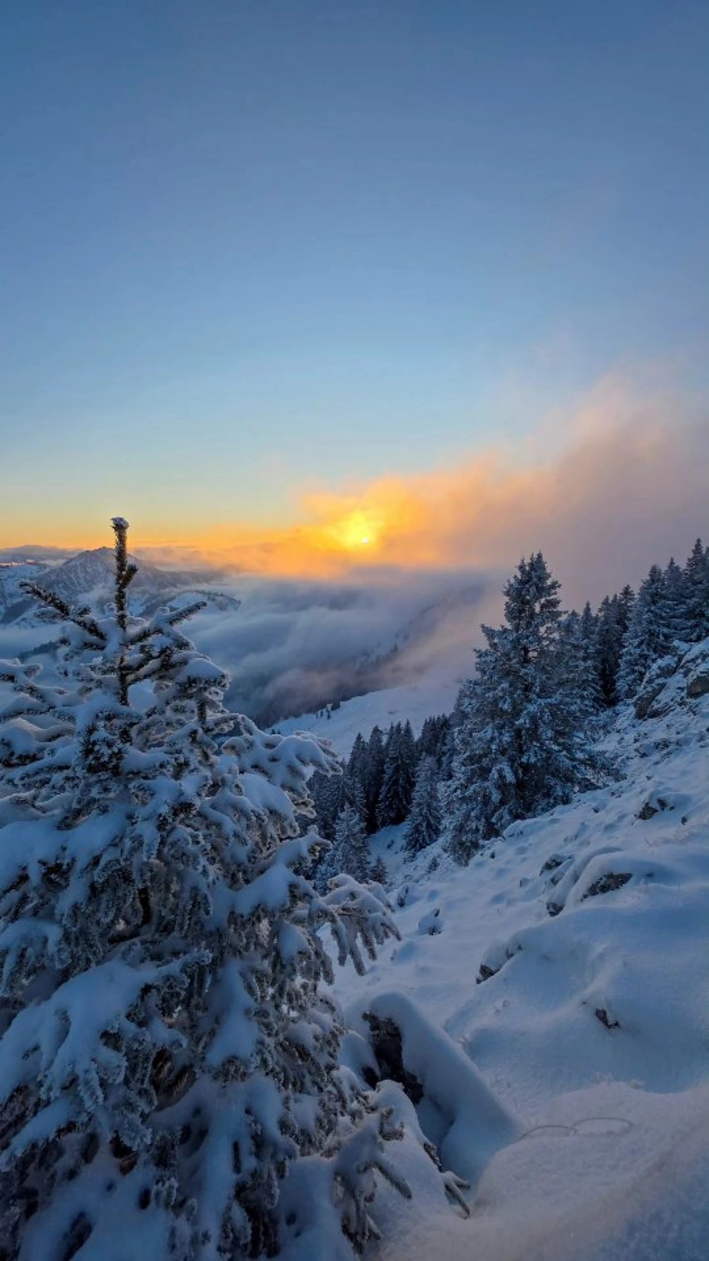Where Light Finds You ☀️🌫️🏔️ Be patient when you find yourself wrapped in fog. The gray will not stay forever. In time, the clouds will drift apart, and the sun will find its way back to you, warming your heart with a soft and healing light. 🌄💛🧡 #mountainlove #evening #snowday #hope #trust